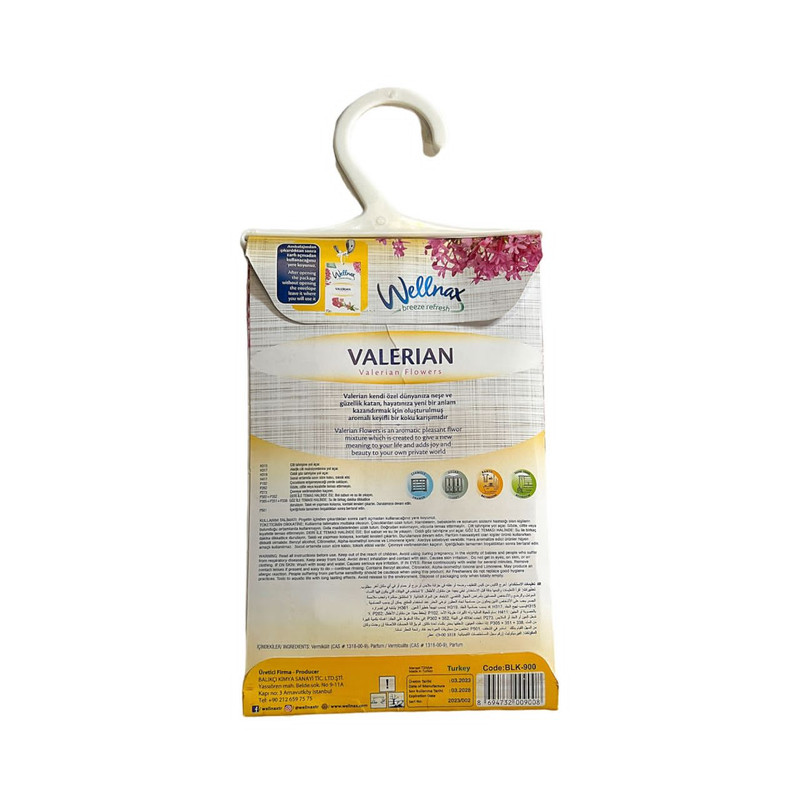 خوشبو کننده ها و ضد بید کمد و لباس مدل VALERIAN FLOWERS از جمله محصولات کاربردی و پرطرفدار برند ترکیه ای Wellnax هستند که از جمله تولید کنندگان معتبر مواد و لوازم شوینده و بهداشتی می باشد. این خوشبو کننده ها در بسته های 21 گرمی عرضه شده و دارای رایحه های متنوع و نسبتا قوی می باشد که می تواند برای خوشبو نگاه داشتن کمد و کشوهای حاوی لباس، رخت خواب و حتی سرویس بهداشتی و محل کار و زندگی استفاده شود. این محصول به شکل پاکتی درون یک لفاف سلفونی به دست شما می رسد. برای استفاده کافیست تا پاکت را از سلفون خارج کرده و در محل مورد نظر قرار دهید. برای راحتی یک گیره آویز نیز روی این پاکت قرار دارد که به شما امکان آویزان کردن آن را روی میله کمد یا سطوح دلخواه دیگر می دهد. به یاد داشته باشید که افراد داری آسم و سایر بیماری ها تنفسی نباید در معرض این خوشبو کننده قرار بگیرند و محتویات این خوشبو کننده مناسب تماس با پوست نمی باشند و می بایست از دسترس کودکان دور نگاه داشته شوند.
